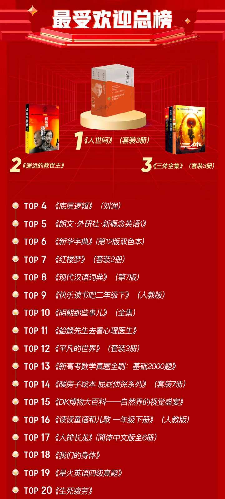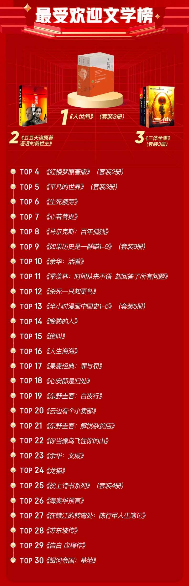 著名作家梁晓声的长篇小说《人世间》、豆豆的长篇小说《遥远的救世主》、刘慈欣的科幻经典《三体》分列总榜前三名,使文学类图书在榜首形成垄断优势。《人世间》是由于今年春节期间同名改编电视剧的热播等因素爆火,《遥远的救世主》同是由于改编电视剧在短视频平台走红而导致原作持续热销,王志文塑造的丁元英这个形象更是深入人心。