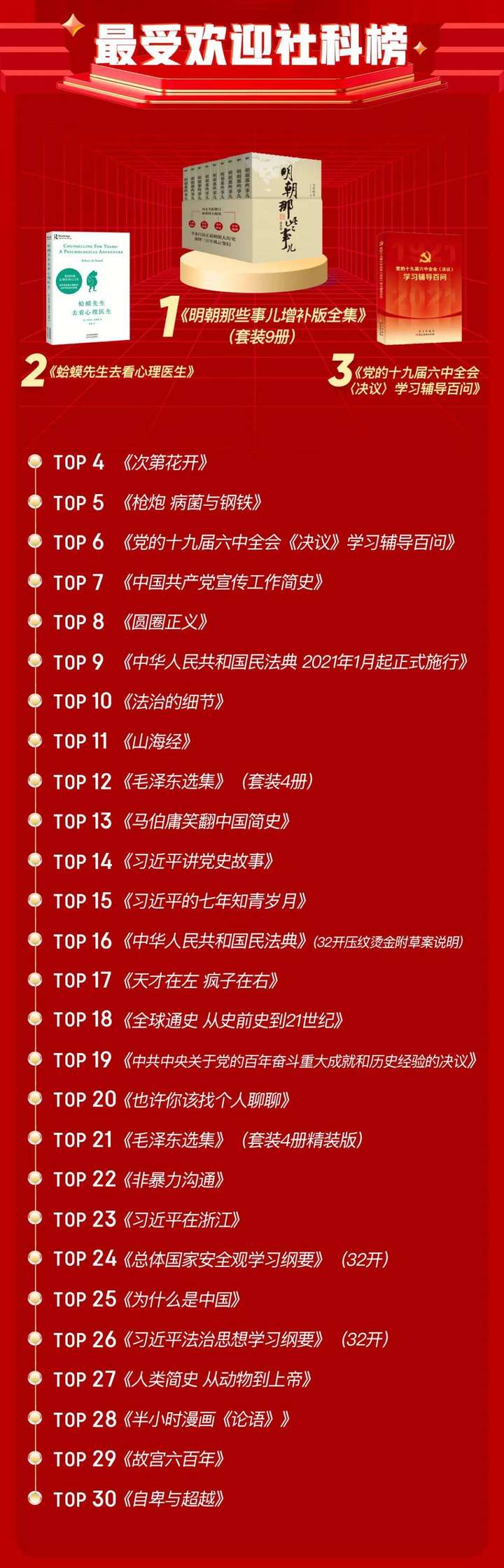 在社科榜中,党政类主题图书上榜最多,其余入围榜单的作品多为长期畅销书。其中,排在第一位的《明朝那些事儿》一直是畅销榜常客,但其登顶社科榜,却是与最近这套书在东方甄选直播间的热销有关。排名第四的《枪炮、病菌与钢铁》也是一本老书,曾在2014年、2016年出版过,目前上榜的是包含解读本的2022年新版,这本书描述的环境、地理、生物因素对人类的影响发人深省。网红法学教授罗翔的《圆圈正义》,通过分享其求学经历与人生心路,以有厚度、有温度的笔法塑造法治思维,他的另一本《法治的细节》携手登榜。