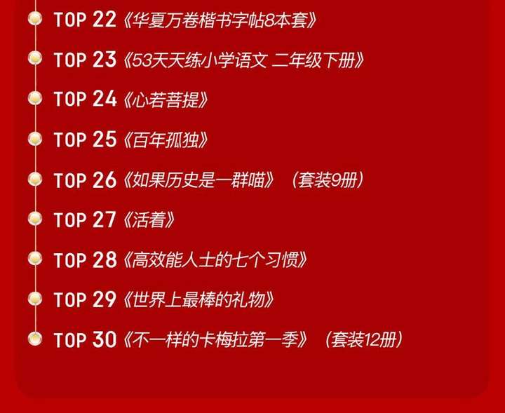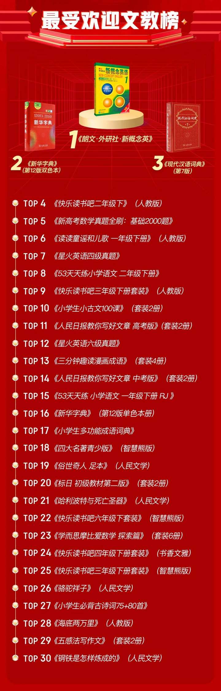 图书畅销榜,包括总榜、新书榜,以及文学、经管、童书、社科、科技、励志、生活、艺术、文教、考试等10个类别的分榜,每个榜单均有30种图书入榜,入榜图书总数超过300种。