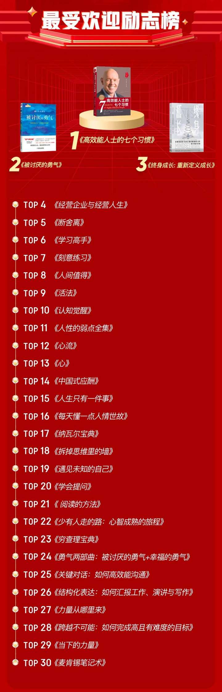 励志榜入围图书则呈现出多元化趋势。《高效能人士的七个习惯》、《断舍离》、《刻意练习》讲的是关于个人习惯养成和自我完善;《终身成长:重新定义成长》则重新定义了什么是“成功”;《中国式应酬:应酬是门技术活》教你如何更好的与人打交道;《活法》聚集了日本“经营之神”稻盛和夫一生的智慧和经营哲学……无论是经典著作还是上市新书,都能帮助我们成为更好的自己。
