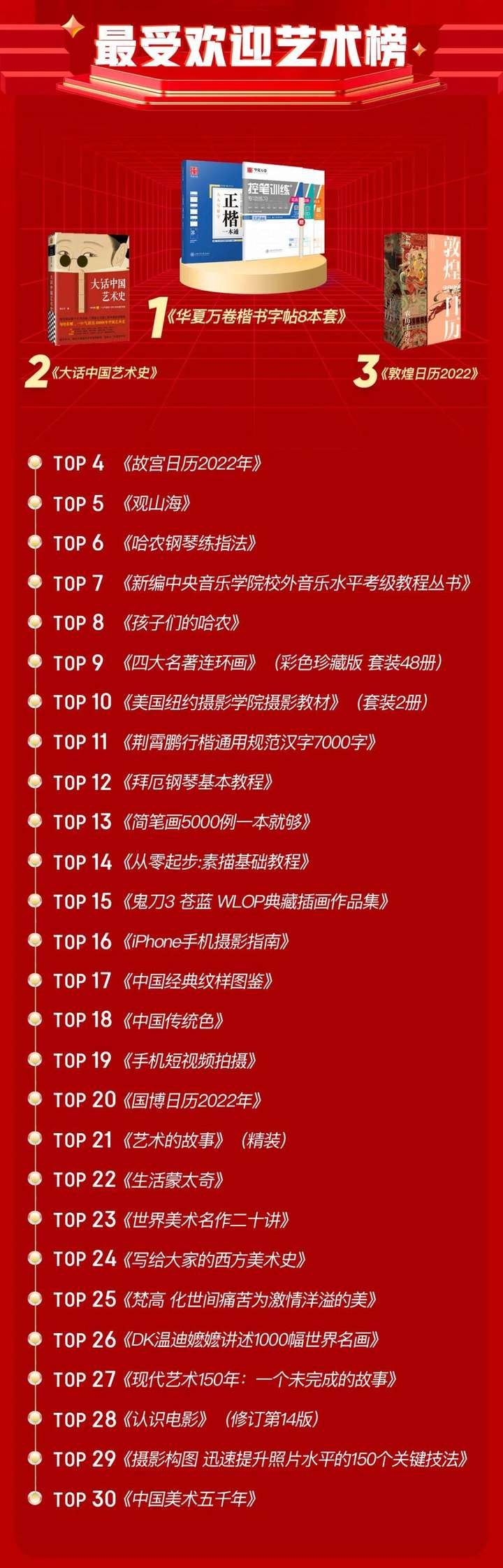 艺术榜以音乐、书法、绘画等艺术普及类的青少年艺术教材为主。其中,意公子的《大话中国艺术史》是网红达人意公子讲解中国艺术史的新书,句句有梗,页页精彩,带领读者认识中国艺术这个“最熟悉的陌生人”,一举冲到了榜单第二名的位置。《敦煌日历2022》《故宫日历2022》《国博日历2022》等日历书的入选,反映出优秀日历产品的持久价值。